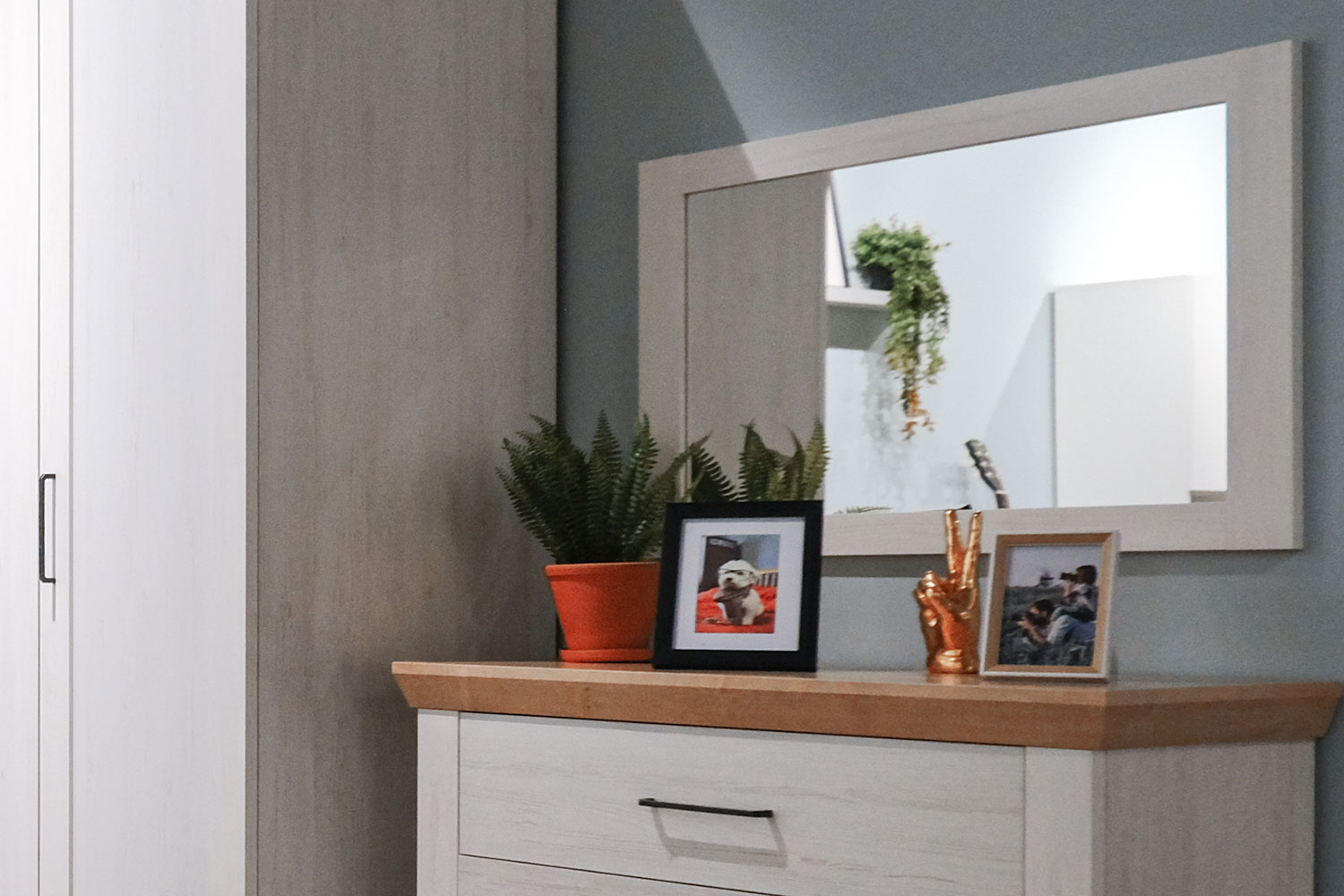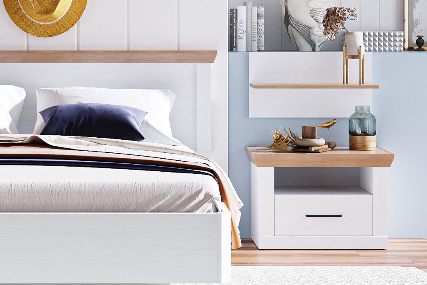 Мебель выполнена в цветах «блан шене» и «дуб бунратти»;