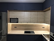 Фасады кухонного гарнитура изготовлены из МДФ толщиной 19 мм в пленке ПВХ. Собирается каркас на фурнитуре от Hettich. Все края обработаны кромкой ПВХ 0,4 мм. То есть, внутрь полотна не попадает влага, которая приводит к деформации. Чтобы пользование было комфортным, все выдвижные и открывающиеся элементы оборудованы доводчиками.