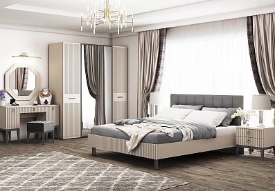 - Фасады ящиков: МДФ с декоративной фрезеровкой в виде вертикальных полос и окутаны плёнкой ПВХ;