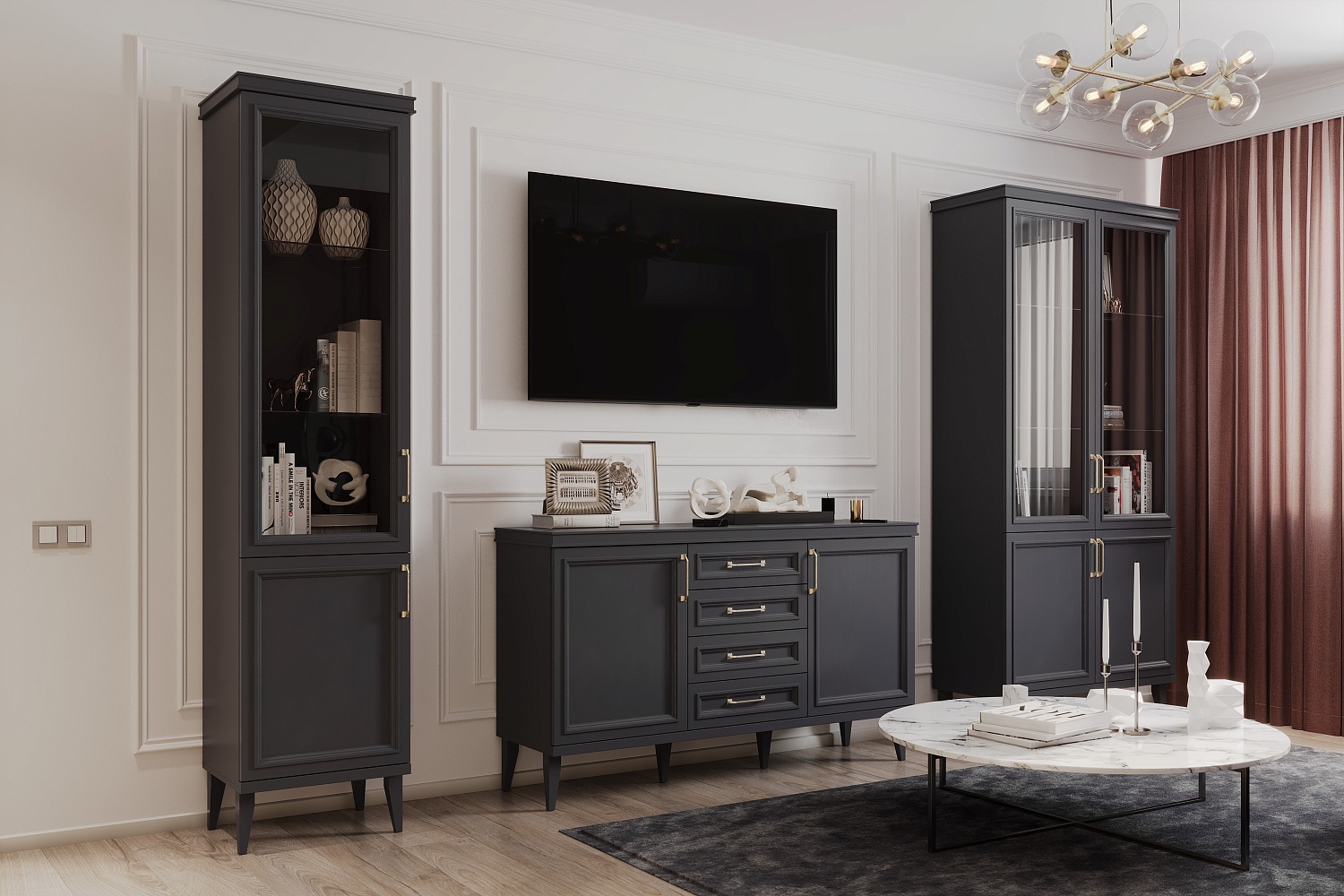 - Шкафы укомплектованы полками ЛДСП за глухими фасадами и стеклополками за стеклянными фасадами;