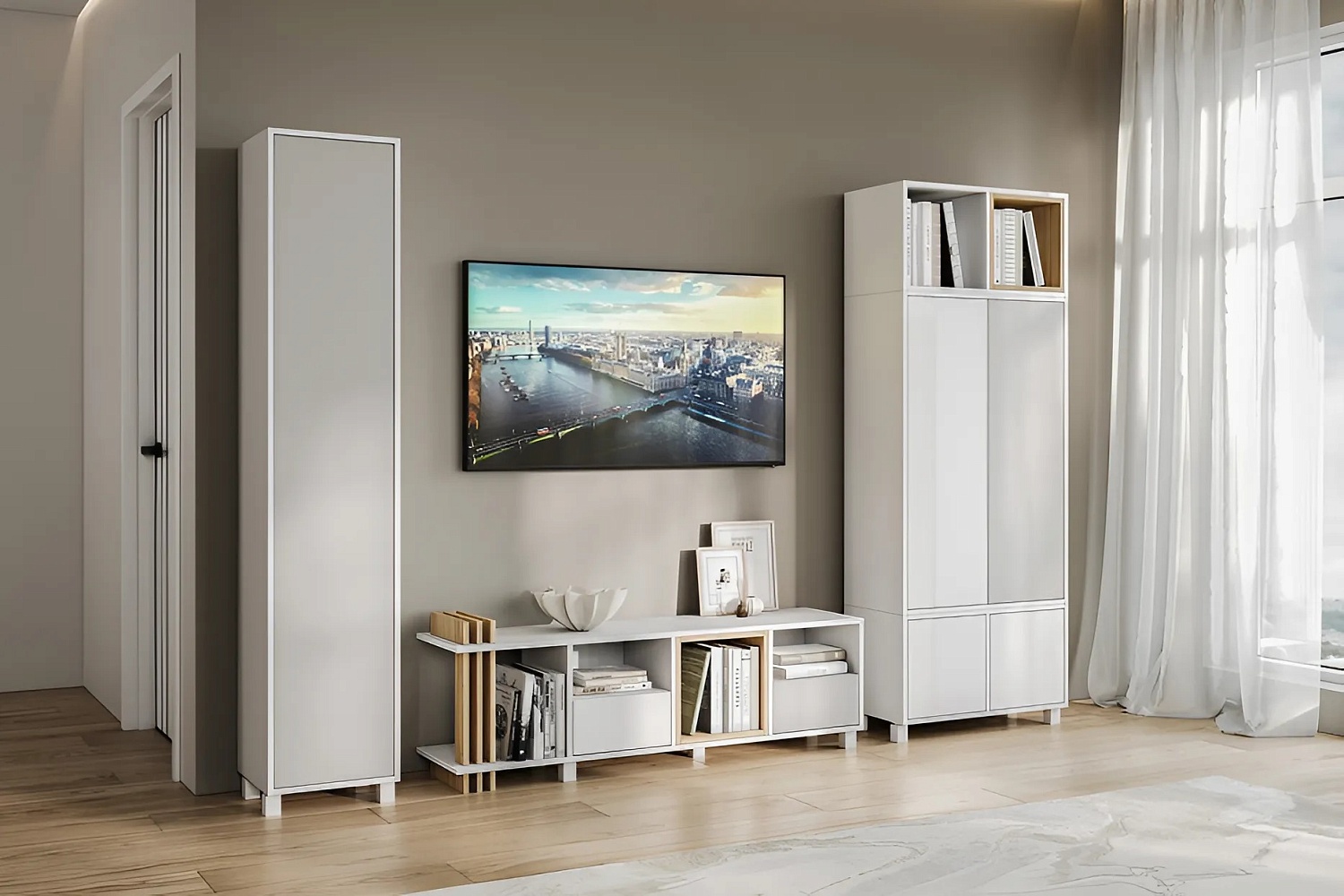 "Троя" - стильная мебель с лаконичными формами, которая сочетает белый каркас с белыми и серыми фасадами, подходящие для любого интерьера. Вставки в цвет дерева вытягивают пространство и добавляют интереса.
