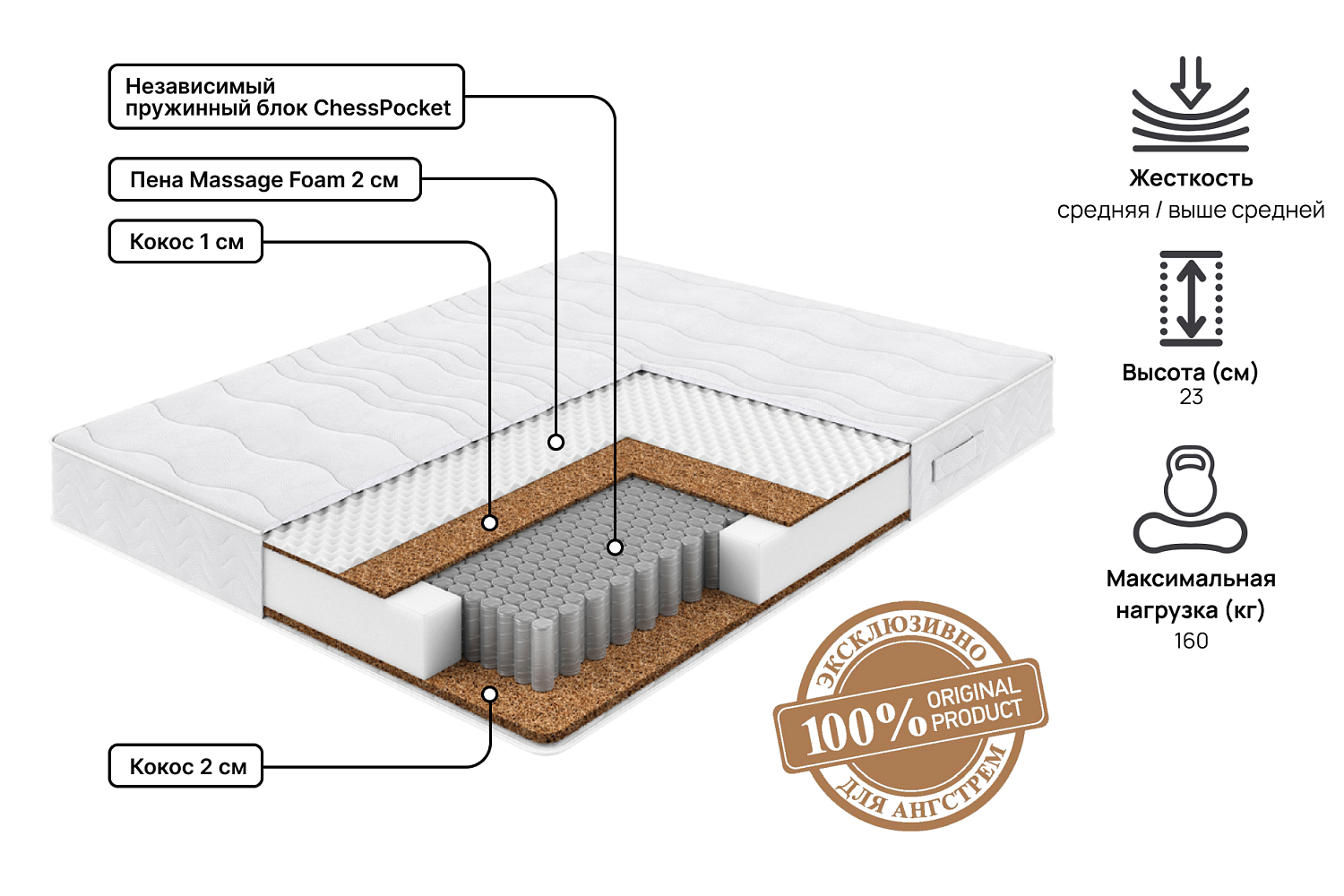 Двусторонний матрас Twist обладает разным уровнем жесткости сторон. Благодаря блоку независимых пружин ChessPoket, расположенных в шахматном порядке, обеспечивается оптимальная поддержка позвоночника во время сна. Каждая пружина работает отдельно от остальных, обеспечивая точечную поддержку тела и минимизируя передачу движений. Массажная пена создает комфортное ощущение мягкости и позволяет снять напряжение мышц.