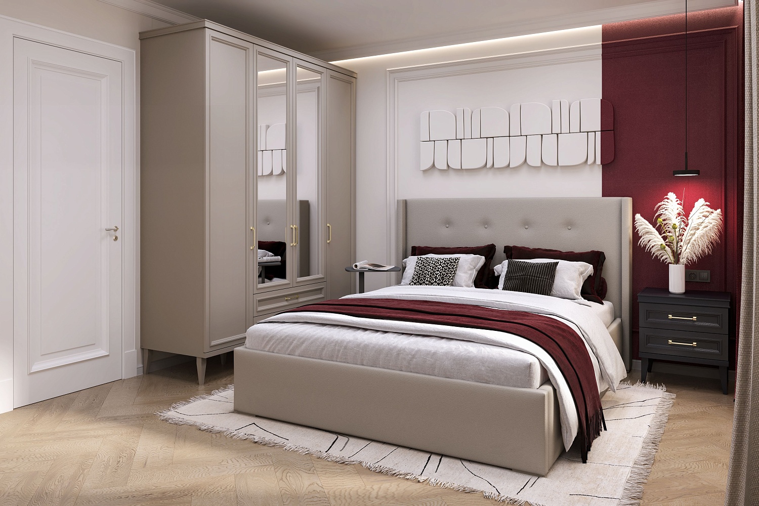 - Шкаф 4-створчатый с центральными зеркальными фасадами, 2 боковыми глухими фасадами и 2 выдвижными ящиками;