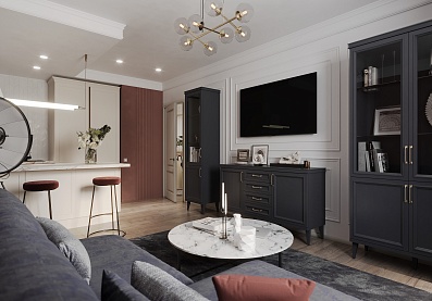 - Фасады: рамочной конструкции из профиля МДФ, окутанного бумагой с «финиш-эффектом», в «глухих» фасадах — вставки из ЛМДФ 0,6 см, в зеркальном фасаде — вставка зеркало 0,4 см;
